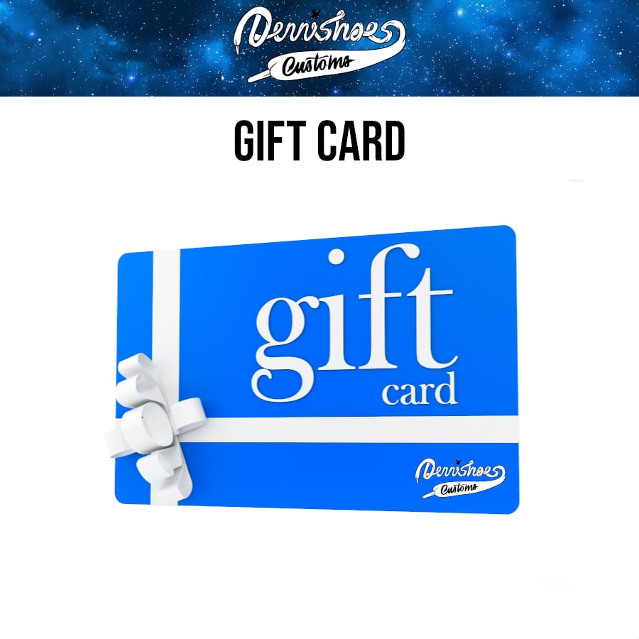 Gift cards can be used with any Dennishoes Customs sneaker options and merchandise. Code is valid for 365 days after purchase. Gift card codes can not be applied to purchasing more gift cards.